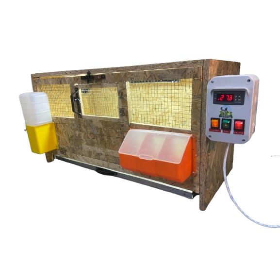 Isıtıcı lambası, otomatik yem ve su sistemi ile donatılmış profesyonel civciv büyütme kafesi. 50 civciv kapasiteli, kolay temizlenebilir taban.